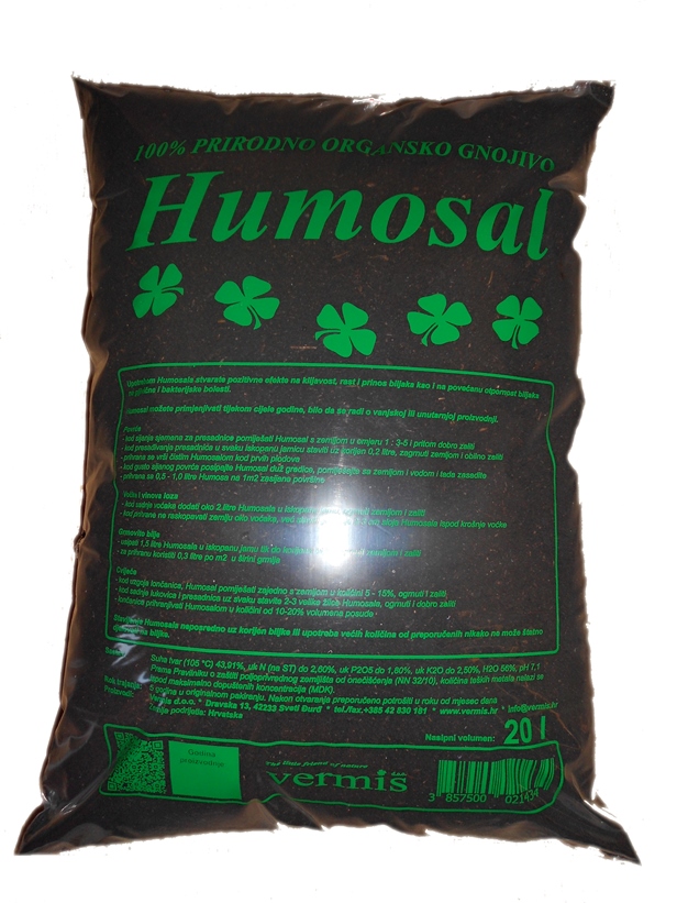 Humosal ist 100% natürlicher organischer Dünger, der aus dem beschleunigten biologischen Abbau von organischen Abfällen mit Hilfe von roten kalifornischen Würmern (lat. Lumbricus rubellus) erzeugt wird. Die Erzeugung wird unter kontrollierten Bedingungen mit täglicher Betreuung und durch einen hohen Technologischen -und Wissensstandard überwacht.